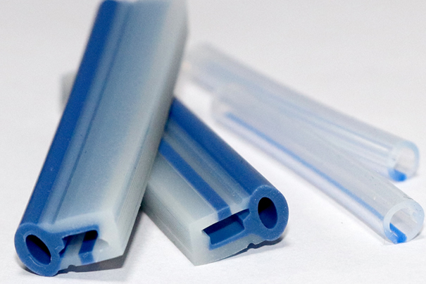 擠出機頭也是產品的截面形狀,有一定長度,在力與溫度的作用下,機頭出來產品經過高溫硫化成型。此工藝成型的產品一般是條形的產品,產品截面可以各種各樣。譬如,矩形長條,環形硅管,等.